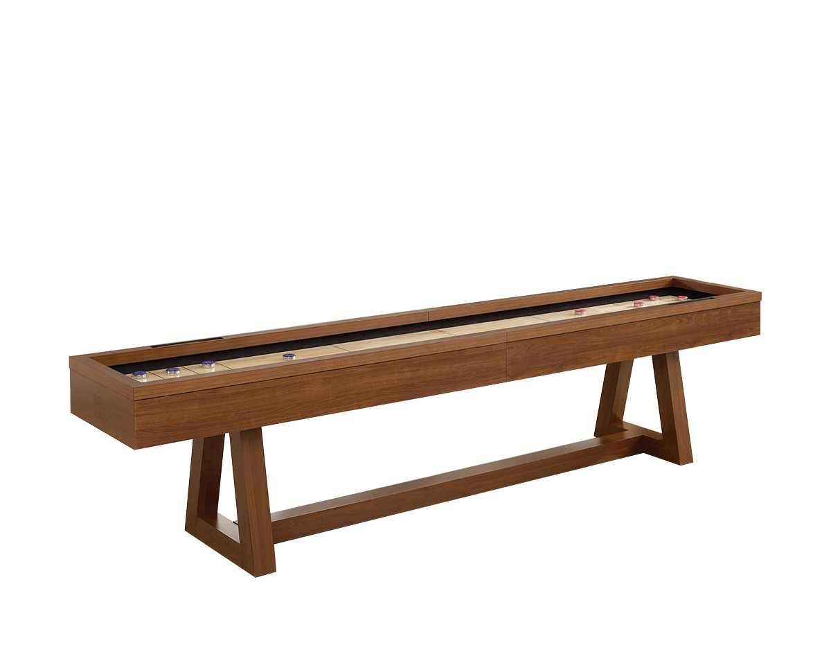 Introducing the 12' Aiden Shuffleboard Table - where elegance meets durability. Finished in a beautiful coffee color, this table is constructed from premium engineered wood and melamine board, supported by a sturdy 16" wide x 2-1/8" high rubber wood frame. The polymer-coated playfield ensures seamless gameplay, and the built-in climatic adjusters allow you to customize the playing surface. Designed for all skill levels, it features multiple scoring systems for both novice and advanced players. Complete with (8) ABS and chrome-plated steel pucks, the Aiden Shuffleboard Table offers a stylish centerpiece for any game room.