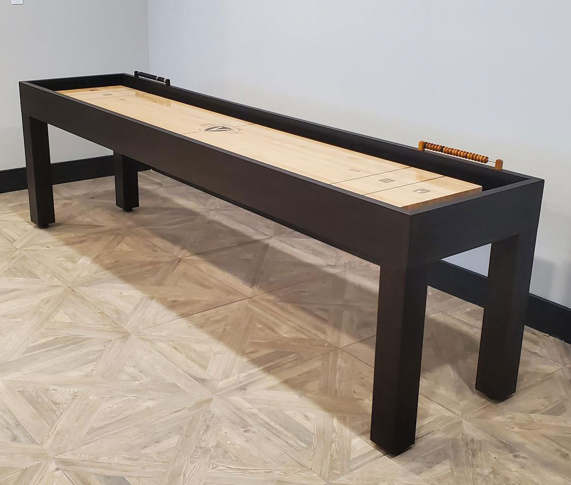 The playing surface can be ordered to arrive in two pieces, with wooden dowels to ensure perfect alignment. This option makes it easier to get a larger shuffleboard table into the room of choice in the case of restraints caused by narrow hallways, staircases, or elevators.