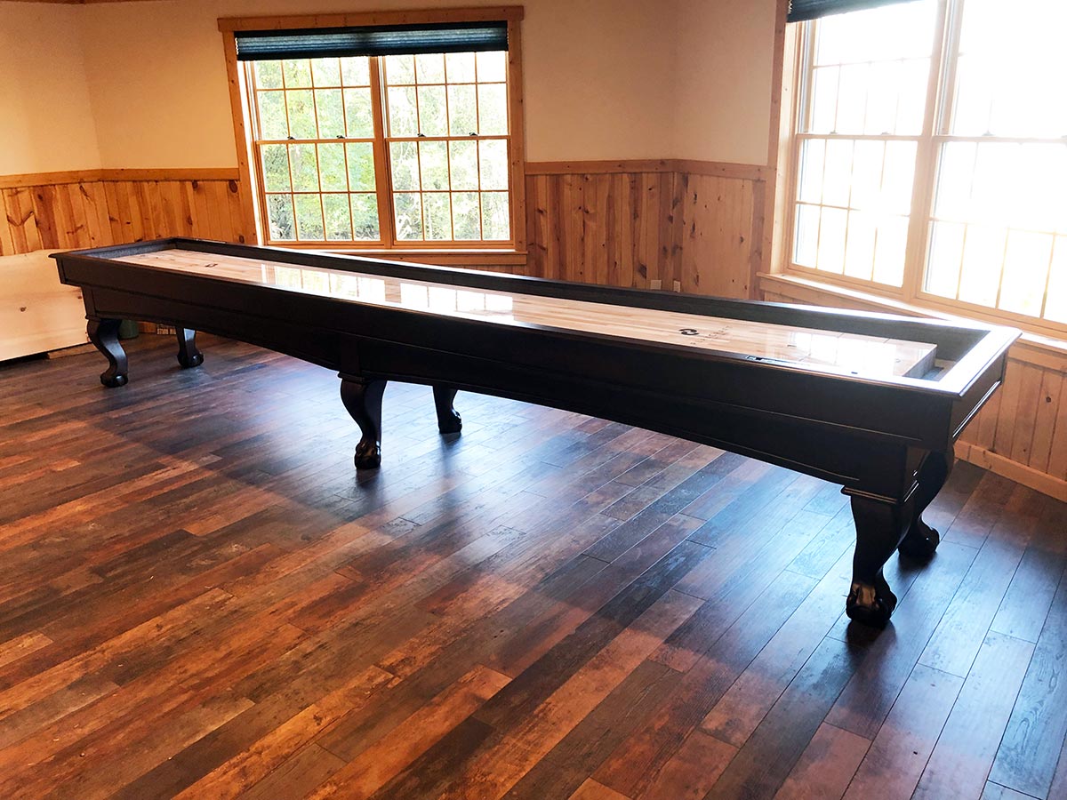 Part of the new Fairfield collection, the Charles River shuffleboard table is helping to redefine expectations. Made from select hardwoods and precision machined components, the Charles River is engineered for a quality assembly and a lifetime of reliable play. All components assemble via machined bolts and inserts. The playfield is true vertical stave butcher block made from Canadian maple with a poured polymer surface. Markings are traditional 1-2-3 and table lengths are 12', 14' or 16'. Available in a chestnut or espresso finish, both stains are hand applied for a beautiful result. Precision carvings of table details, including ball and claw legs, match the available companion pool tables. The shuffleboard playfield logo style and/or position may vary.